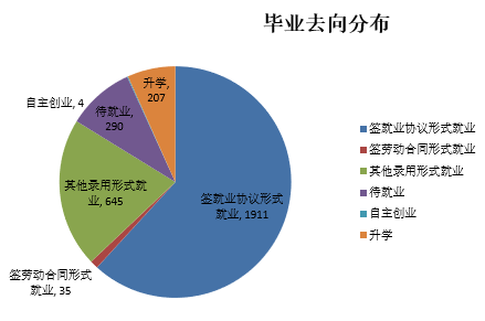 我校2019届毕业生签订就业协议形式就业1911人,占比61.80%;签订劳动合同形式就业35人,占比1.13%;其他录用形式就业645人,占比20.86%;升学207人,占比6.69%;自主创业4人,占比0.13%;无就业意愿290人,占比9.38%。