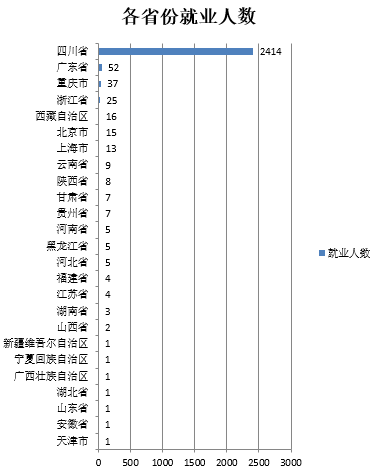 我校2019届毕业生就业地区涵盖北京、四川、重庆、广东、上海等25个省(直辖市、自治区)。主要热门就业地区依然为四川省,共计2414人,占比91.51%;其次为广东,就业52人,占比1.97%;重庆37人,占比1.40%;其余零星分布于北京、上海、浙江等地。其中西藏自治区16人,占比0.61%;新疆维吾尔自治区1人,占比0.04%;