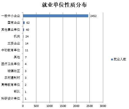 我校2019届毕业生有2420人就业于一般中小型企业,占比93.40%;国有企业62人,占比2.4%;其他事业单位40人,占比1.54%,其余零星分布于机关、科研设计单位、三资企业、中初教育单位、医疗卫生单位、城镇社区等单位。