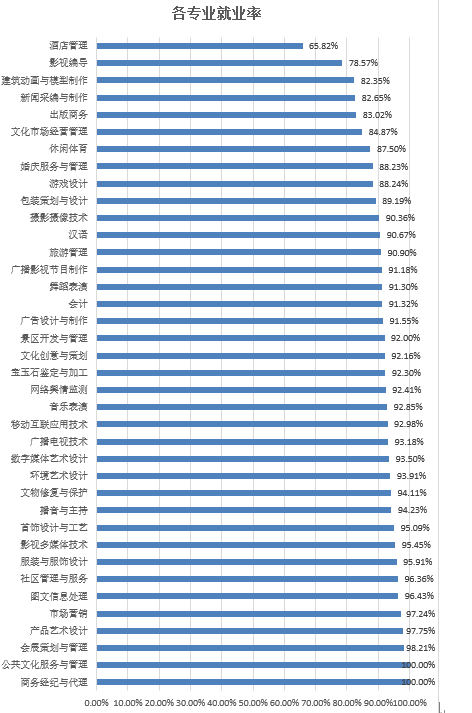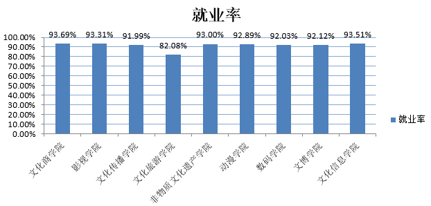 我校2019届毕业生共计3092人,截止2019年9月,已实现就业人数为2826人,就业率为91.39%。其中:文化商学院93.69%;影视学院93.31%;文化传播学院91.99%;文化旅游学院82.08%;非物质文化遗产学院93.00%;数码学院92.03%;动漫学院92.89%;文博学院92.12%;文化信息学院93.51%。