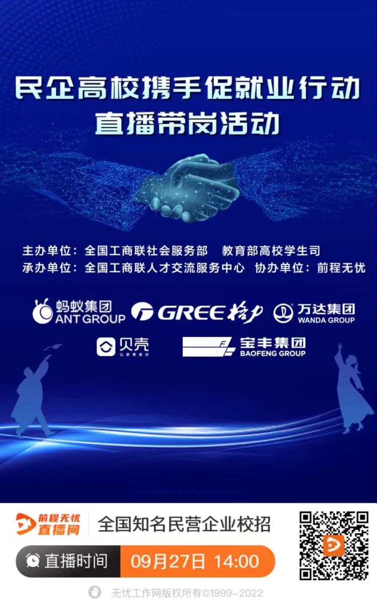 为充分发挥民营企业吸纳高校毕业生就业的重要作用,作为“民企高校携手促就业”系列活动,全国工商联于9月27日14:00-16:00举办“民企高校携手促就业行动”直播带岗活动。本次活动由格力集团、万达等大型民企进行直播宣讲,请23届毕业生积极参加。活动详情可直接扫下方二维码。